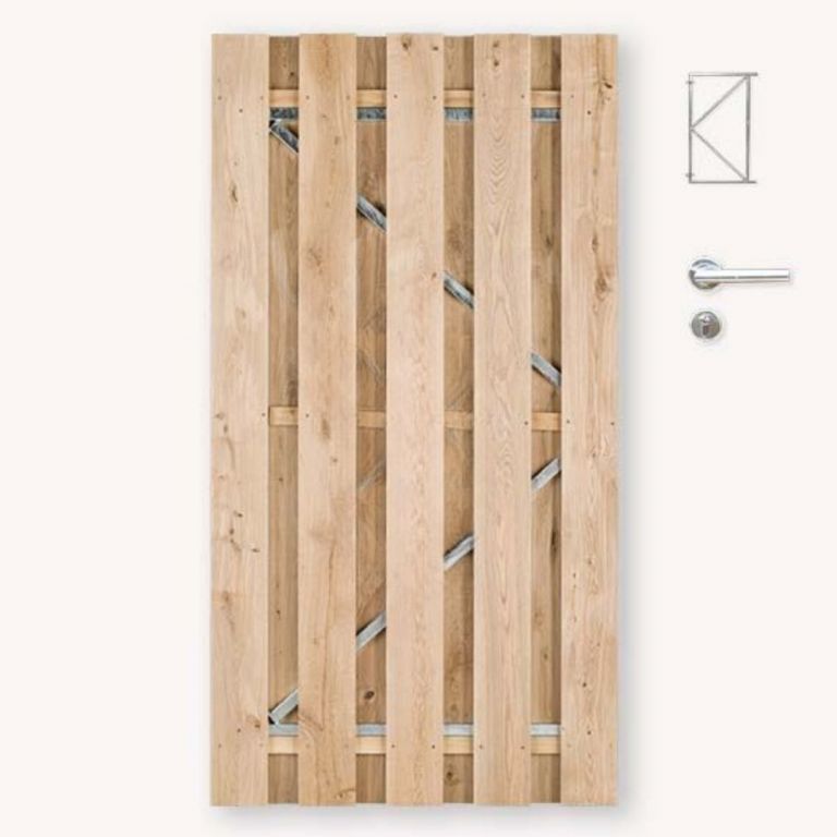 Maak je tuin af met deze prachtige luxe tuindeur, gemaakt van eikenhout. Eiken staat bekend om zijn natuurlijke uistraling vanwege de mooie vergrijzing en scheuren die voor kunnen komen. Deze solide tuindeur heeft een plankafstand van ca. 7,5 cm en biedt daardoor een gemiddelde doorkijk. De bijgeleverde hengen (scharnieren) zijn verstelbaar, waardoor de tuindeur eenvoudig bijgesteld kan worden als deze klemt. Deze eiken tuindeur is 190 cm hoog, 100 cm breed en kan geleverd worden inclusief ingebouwd cilinderslot.